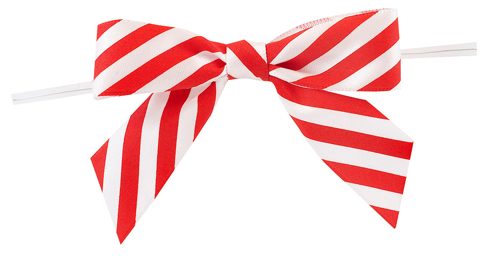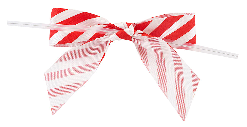 - Ribbon for Gift Wrapping - This set contains 12 bows with Candy Cane Stripes comprised of a 7/8" wide silky satin ribbon. Each bow arrives pre tied and ready for use with a bow 3 1/4" wide and hanging tails.