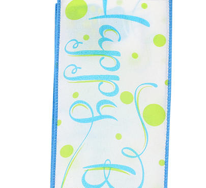 Wired Edge, Polka Dots, Banner Balloons, Cake, Party, Wreath, Baby, Boy, Girl, Bows, Gifts Happy Birthday White Ribbon Roll decorated with Glitter...