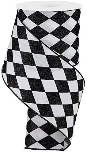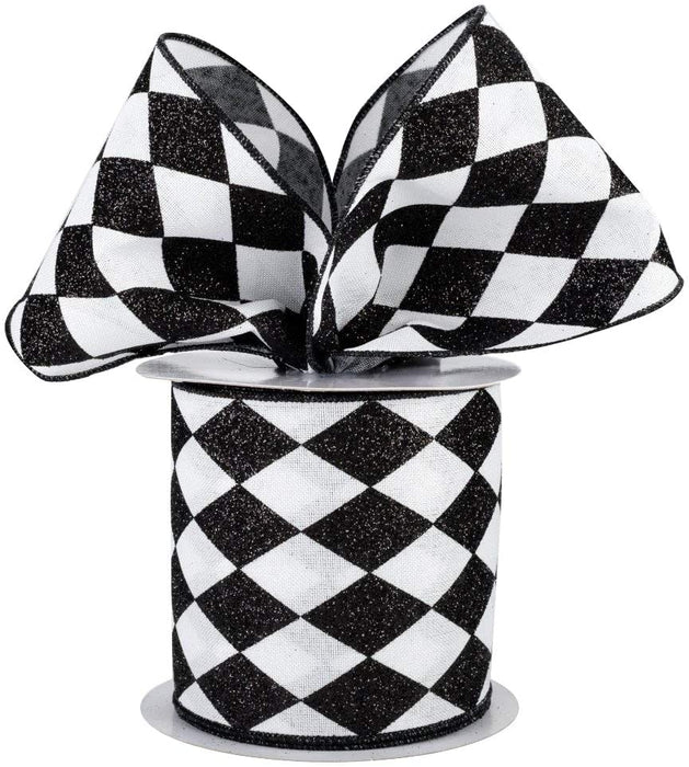 - Classic Joker Diamond Harlequin Ribbon with Black Glitter Diamonds and Black Wire Edges – Perfect for gift baskets, bows, and wrapping presents to make them pop