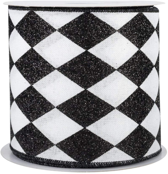 Black White Diamonds Harlequin Ribbon - 4" x 10 Yards, Argyle, Black Wire Edged, Valentine's Day