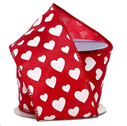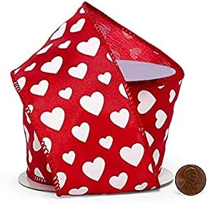 Wired Edge Ribbon, Valentine’s Day Décor, Gift Wrap, I Love You, Gift Bow, Bouquet, Gift Basket Red Satin Ribbon decorated with White Hearts and ...