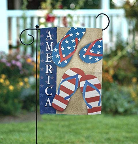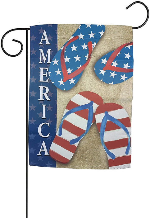 - Outdoor yard flag with two pairs of sandals on sand, one set white stars on navy blue and the other red and white stripes with a vertical blue stripe with muted stars on the left side stating "America" in bold white text!