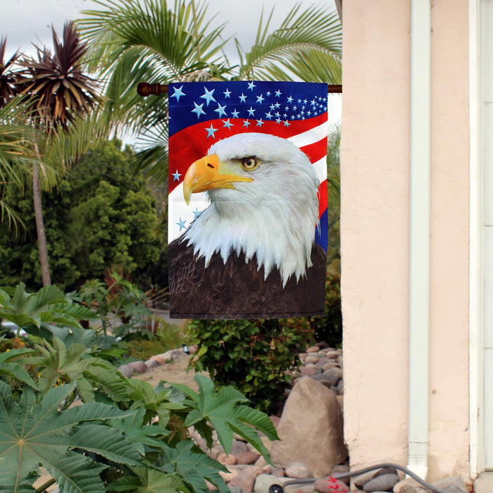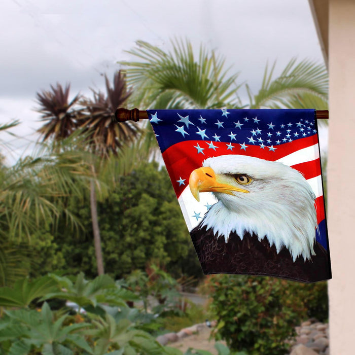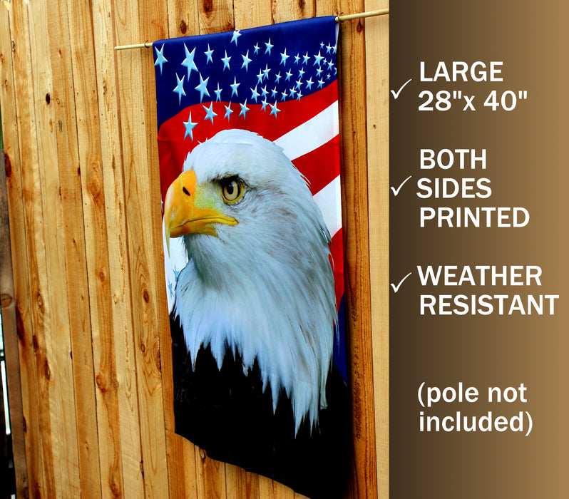 • Outdoor yard flag with a red, white, and blue American Flag style stars and stripes theme with a beautiful Bald Eagle representing the freedom and spirit of the U.S.A.