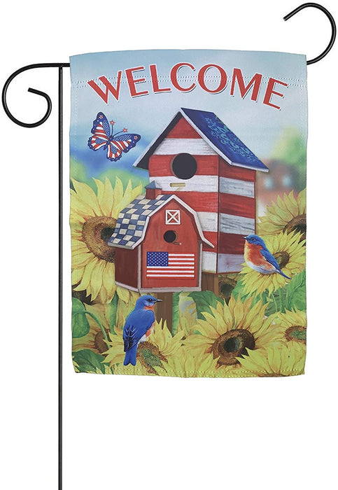 - Outdoor yard flag with Red and Blue Patriotic Birdhouses, blue and red birds, a butterfly all over bright yellow sunflowers, and the greeting "Welcome" in vivid red text above