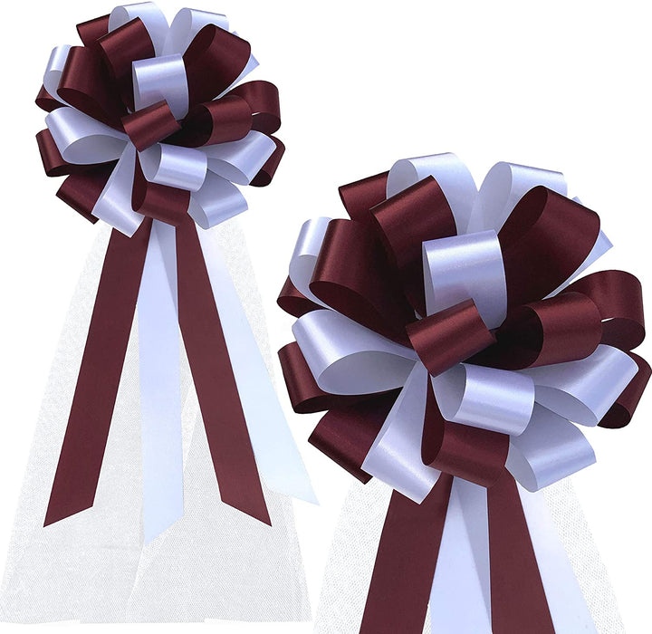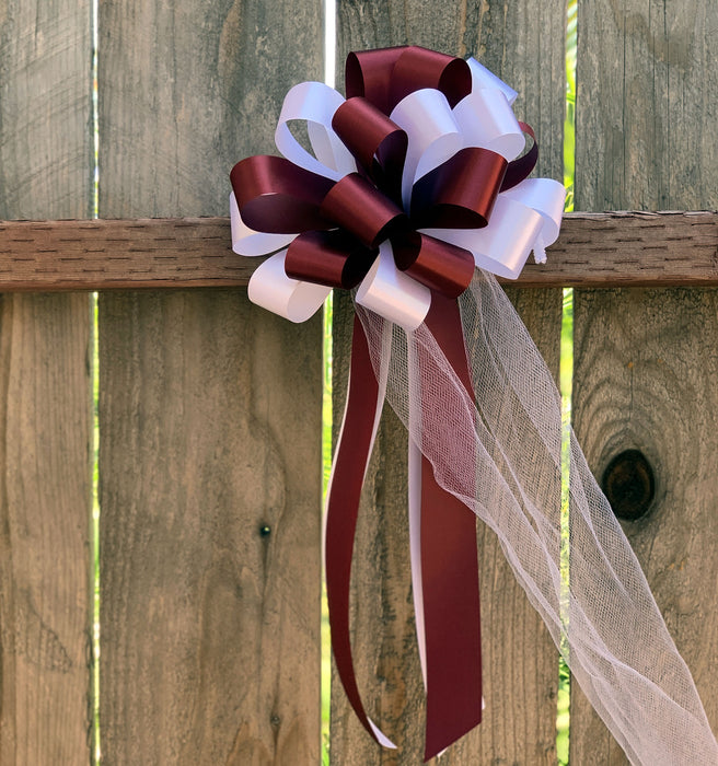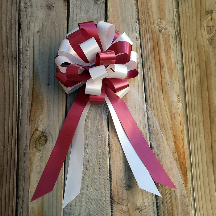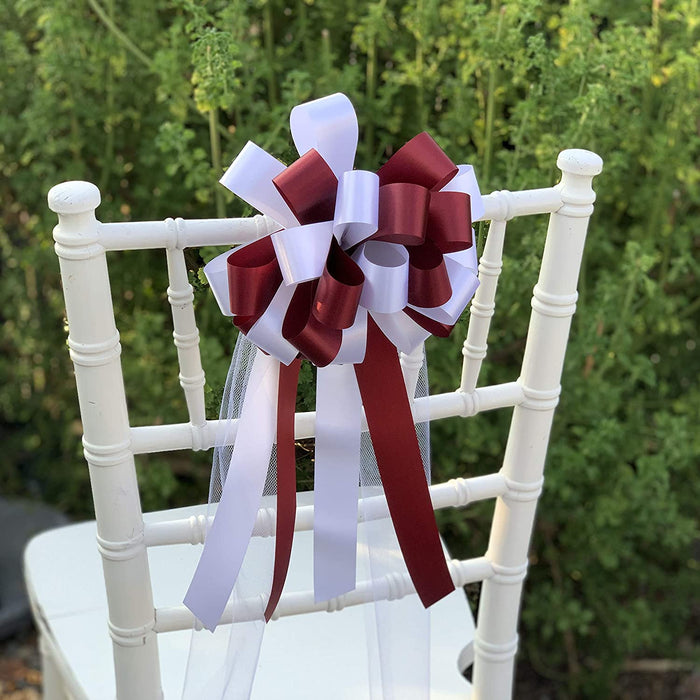 6 Burgundy White 8" Pull Bows, Ribbon, Tulle.Wedding, Party Decorations