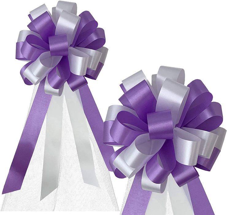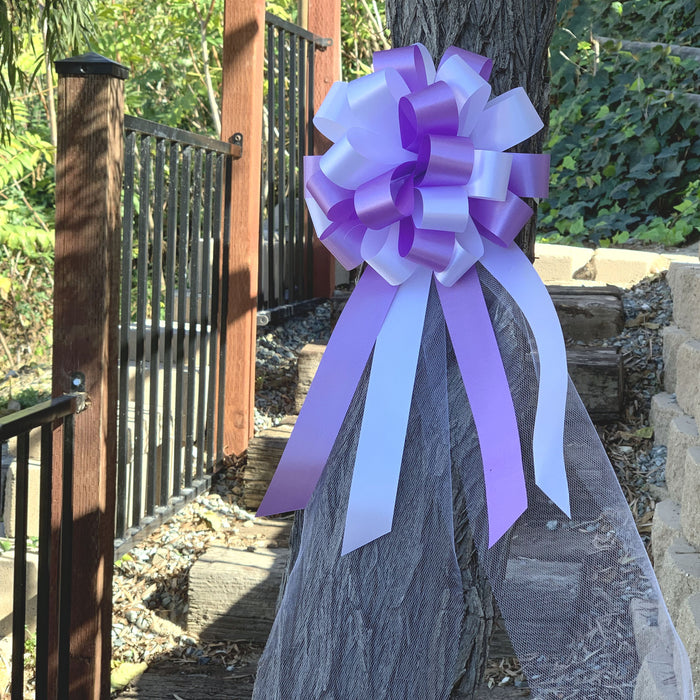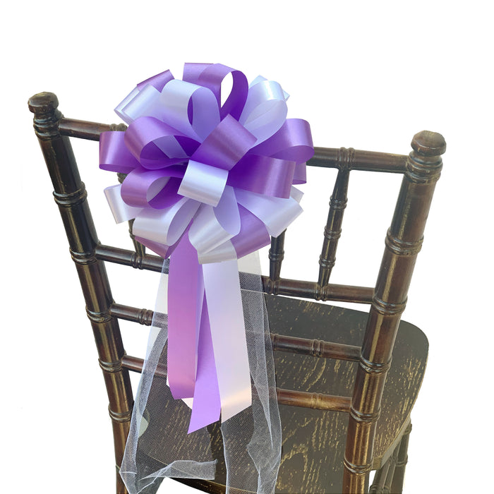 White and Lavender Pull Bows with Tulle Tails - 8" Wide, Set of 6