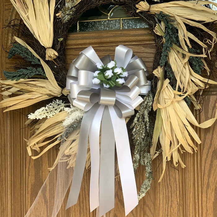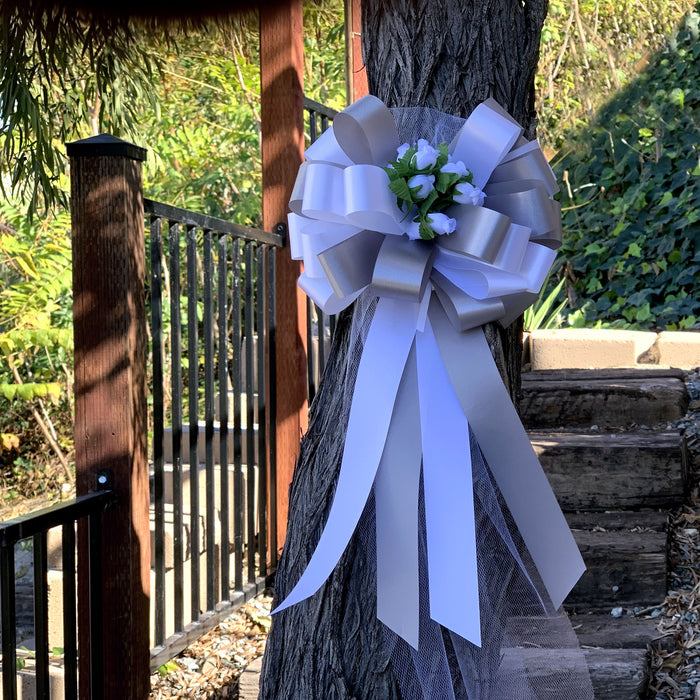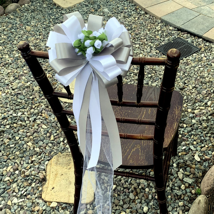 White and Silver Wedding Pull Bows with Tulle Tails and Rosebuds - 8" Wide, Set of 6
