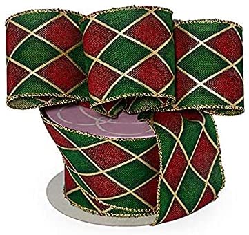 Red, Green, Gold Edges, Argyle, Gift Wrapping, Wreath, Tree Topper Bow Ribbon for Gift Wrapping - Christmas Red, Green and Gold Harlequin ribbon w...