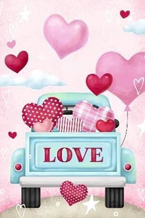 - 12" x 18" Valentine's Day decor garden flag decorated with an abundance of heart designs in Red, Pink and White! The hearts are bursting from the back of a Blue Truck with the word "LOVE" in bright red on the tailgate!