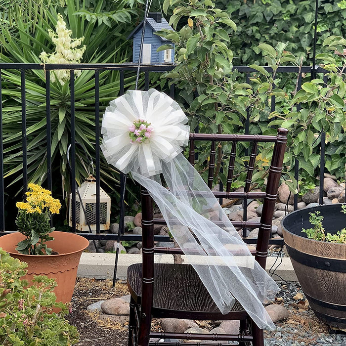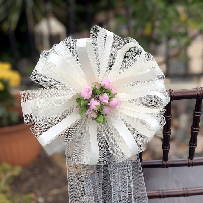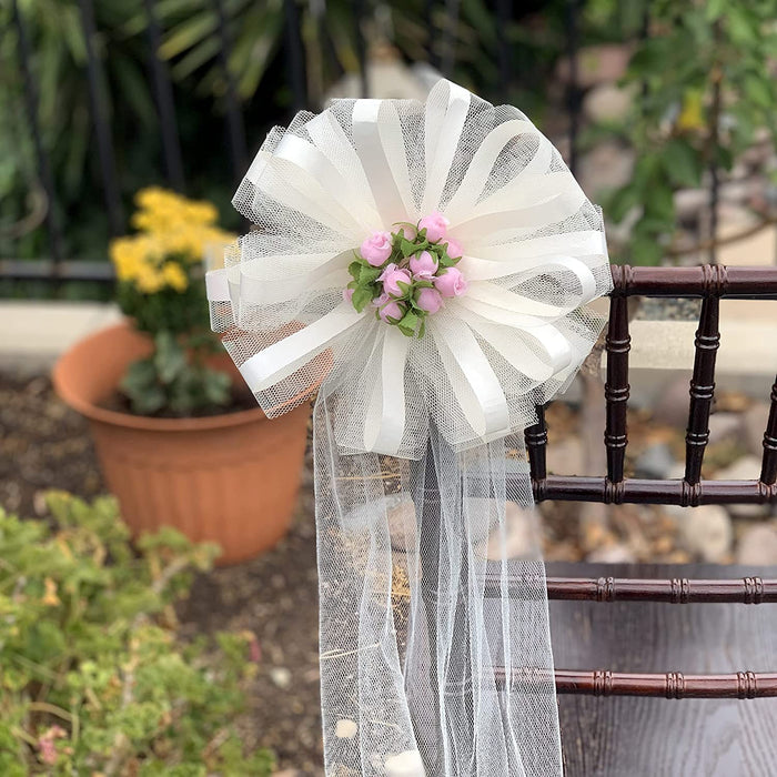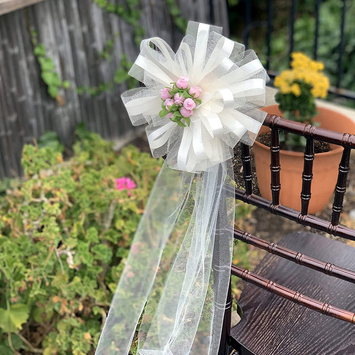 Large Ivory Assembled Wedding Pew Bows with Light Pink Rosebuds & Tulle Tails - 10" Wide, Set of 6