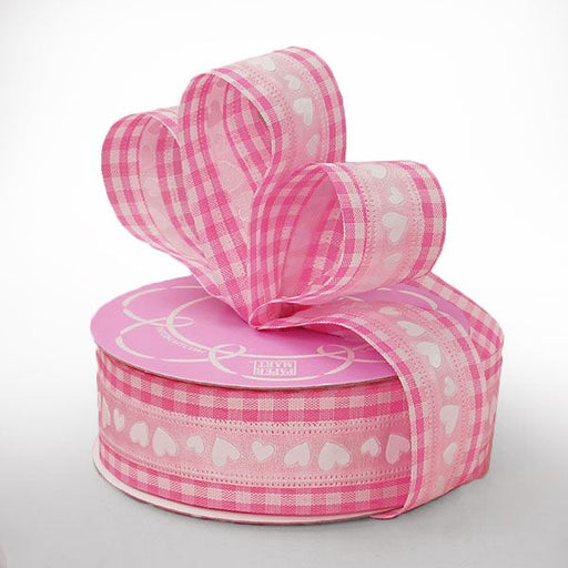 Wired Edge Pink & White Gingham, White Hearts, Gift Wrap, Wreath, Gift Basket, Bows White and Pink Gingham Ribbon with White Applique Hearts ...