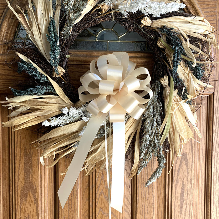 - Simply elegant, made with fine polyester ribbon, approximately 8" wide and 16.5" long from the top of the bow to the bottom of the tails. Customize them to your taste by adding tulle, flowers, leaves, pearls, and stars (not included)