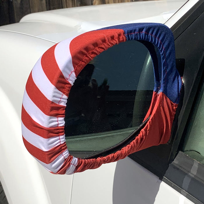 - Decorative side view mirror cover in red, white, and blue stars and stripes décor