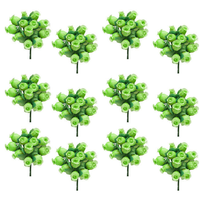 12 faux silk polyester Apple Green Rosebud mini bouquets, with 3" long, bendable green stems and leaves for all your Arts, Crafts and DIY needs
