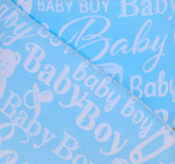- 100% Polyester Wired Ribbon in a Light Blue adorned in White with the words “Baby Boy” accented with a repeating pattern of Onesies, Safety Pins, Pacifiers, Teddy Bears and Blocks!