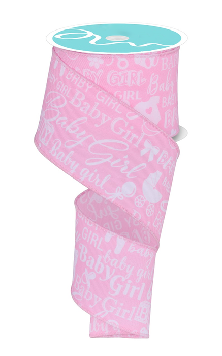 - 100% Polyester Wired Ribbon in a Light Pink adorned in White with the words “Baby Girl” accented with a repeating pattern of Onesies, Bows, Foot Prints, Pacifiers, Strollers and Blocks!