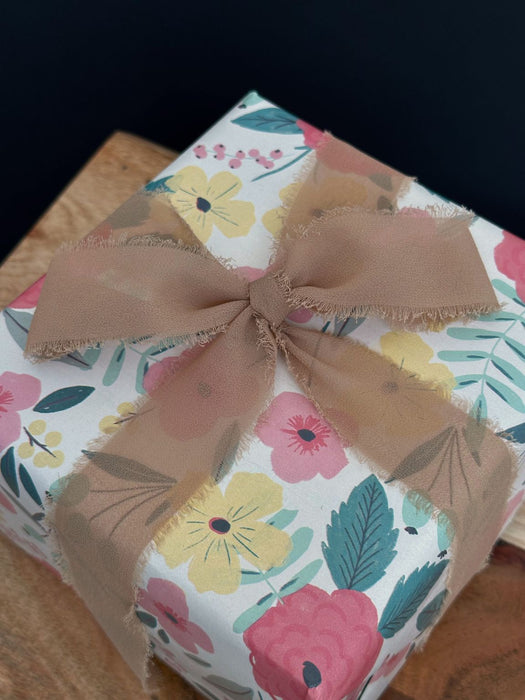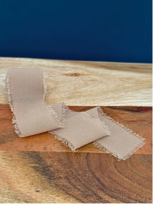 - Flowy Wedding Beige Chiffon ribbon with a delicate touch, perfect for gift baskets, bows, and wrapping presents to make them adorable