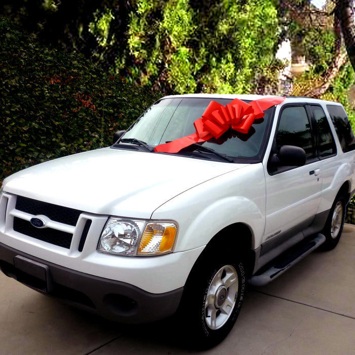 - Huge decorative gift bow, shipped fully assembled, approximately 25” wide with two matching ribbon tails that create a total length of about 60” with tails spread apart