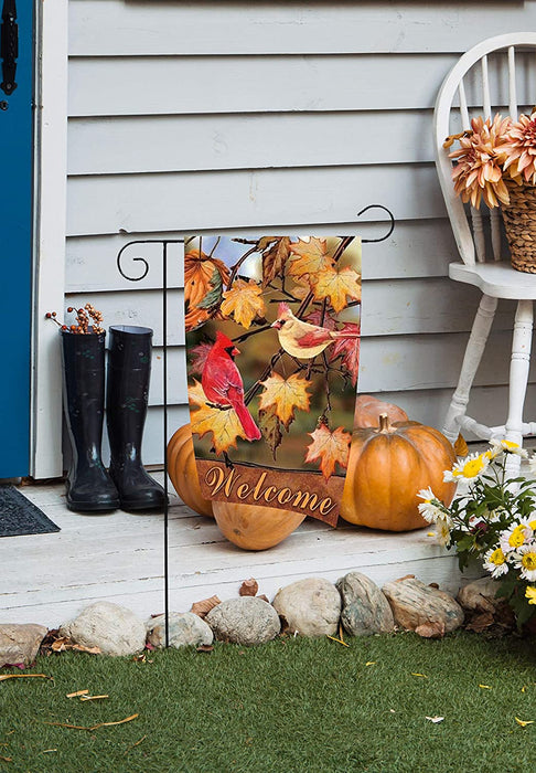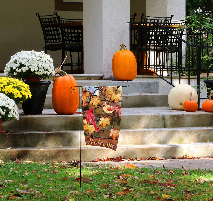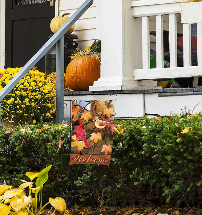 12 inch by 18 inch Autumn garden flag is great for showing your festive and thankful side. This multi colored flag has a red and yellow bird on tree branches with color changing fall leaves all around