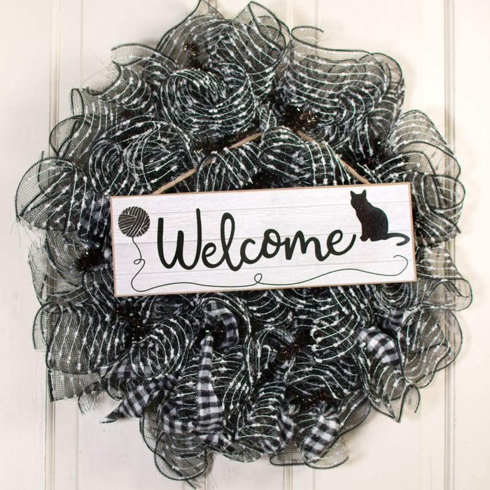 - A Cat and Ball of Yarn adorn either side of 'Welcome' which is underlined with excess yarn for added cuteness - This sign gets 2 paws up!