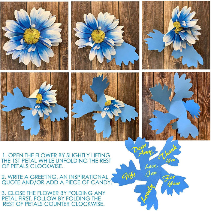 • Each elegant origami flower blooms open petal by petal making room to write words of love and appreciation for friends or family, inspirational themed quotes for a birthday or meeting or even store a small surprise like a chocolate coin, sticker, or picture on the inside
