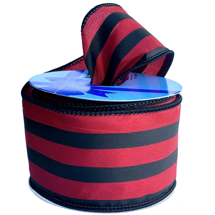 - Comprised of 100% Polyester fabric ribbon 2.5 inches wide with Black and Burgundy Red striped, black stitched wired edges