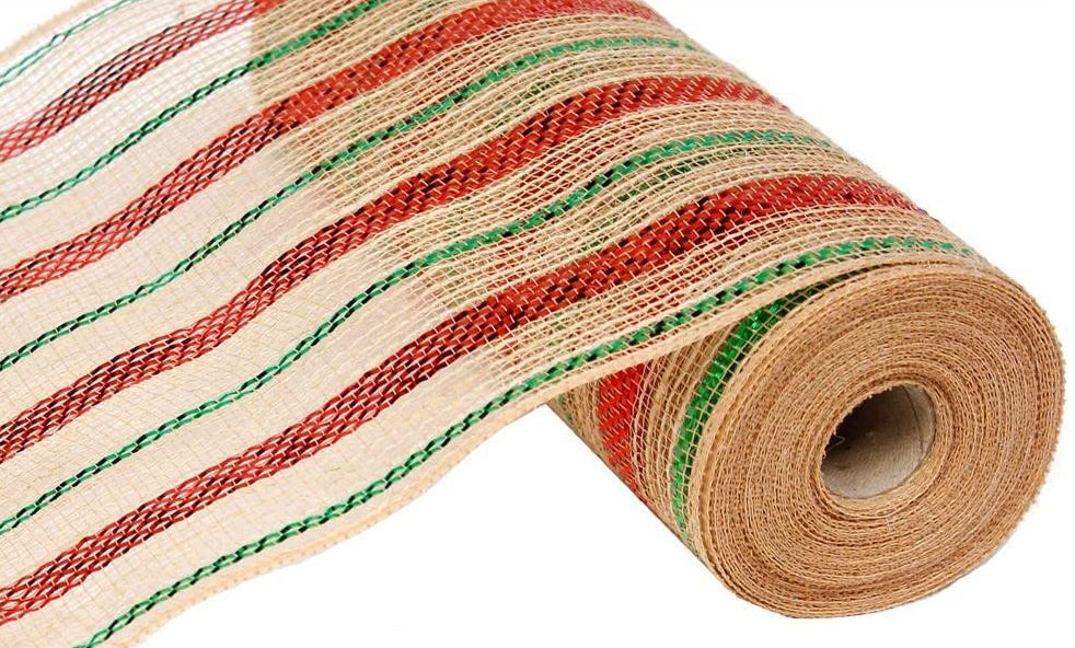 Burlap Striped Christmas Deco Mesh - 10" x 10 Yards, Natural, Jute, Red, Emerald Green