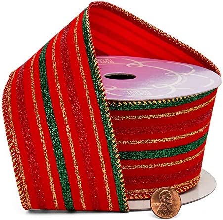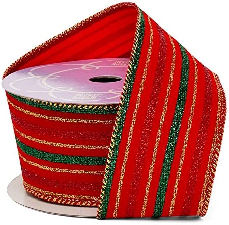 • 100% polyester gold stitched wired edge Red, Green and Gold Glitter Striped Holiday Ribbon – Perfect for gift baskets, bows wreaths, swags, Christmas arrangements, and wrapping presents to make them sparkle!