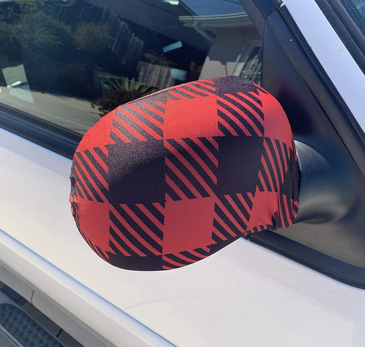 - Decorative side view mirror cover in a classic Red and Black Buffalo Plaid Design
