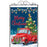 28 inch by 40 inch Christmas garden flag with classic Red Pickup Truck with a Christmas Wreath on the grill carrying a freshly cut Christmas Tree with a Gold Star Tree Topper in the truck bed through a snowy night - The greeting "Merry Christmas" in a classic Christmas text and Christmas Lights hover over the Pick up Truck