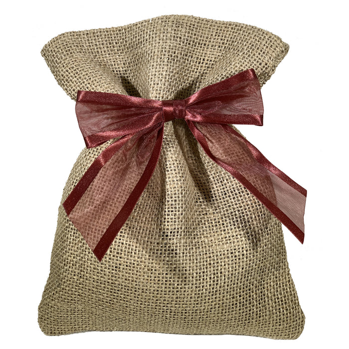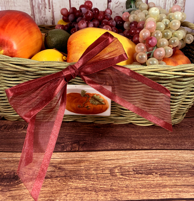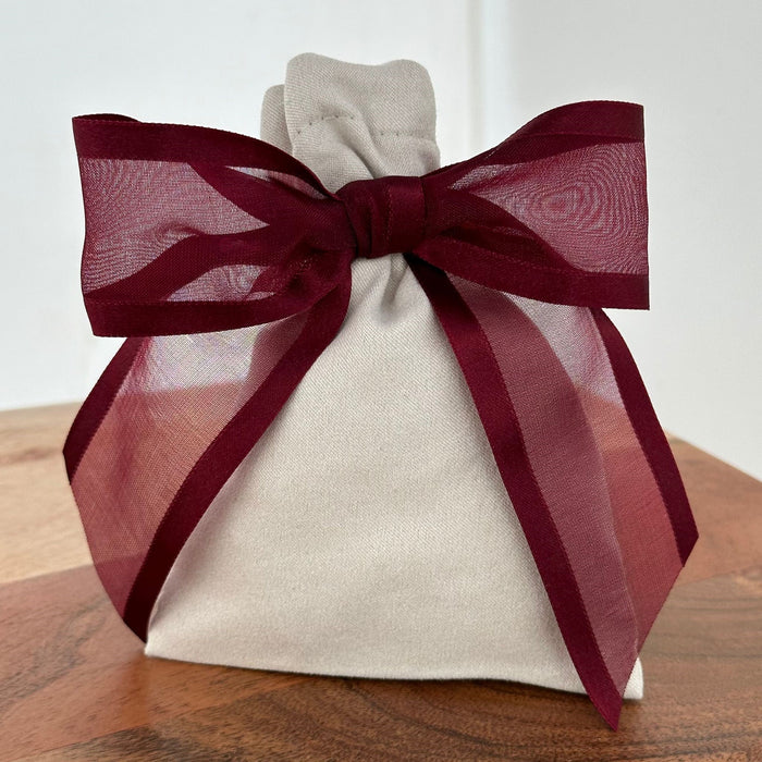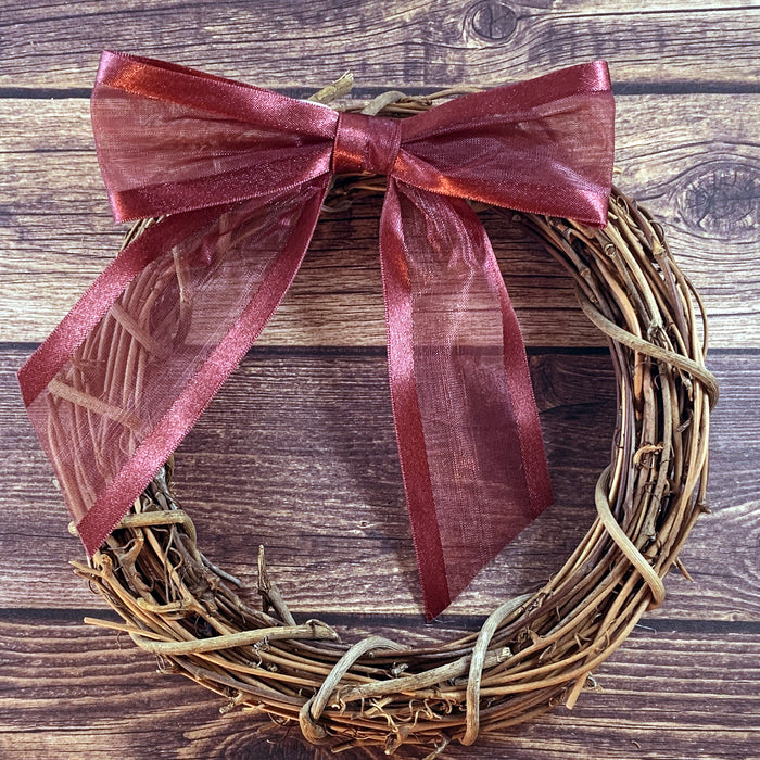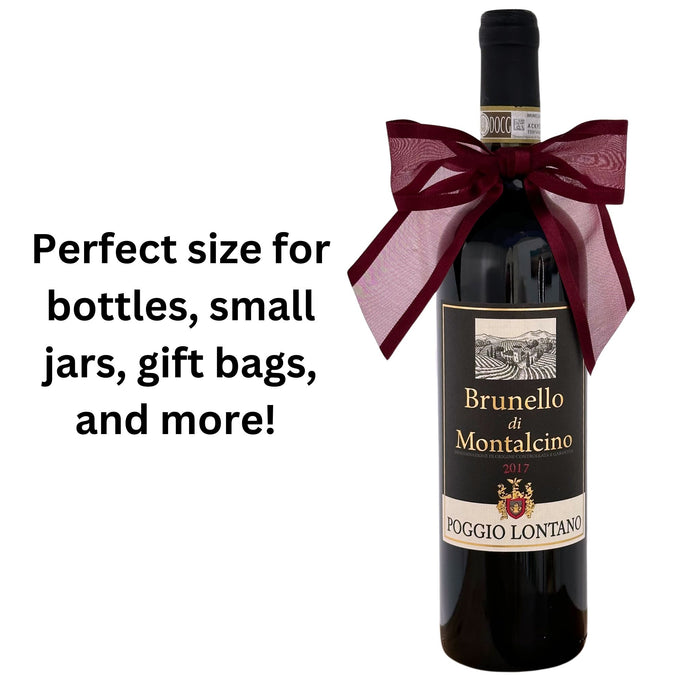 - Ribbon for Gift Wrapping - This set contains 12 Burgundy bows comprised of a 7/8" wide silky satin edge ribbon with a sheer Organza center. Each bow arrives pre tied and ready for use with a bow 4" wide and hanging tails.