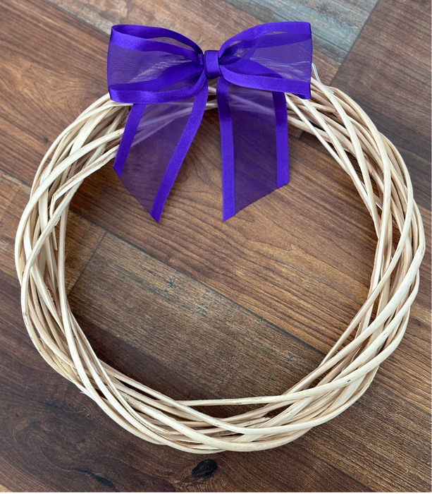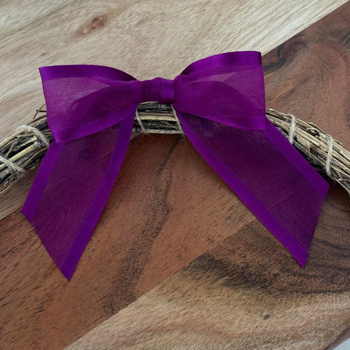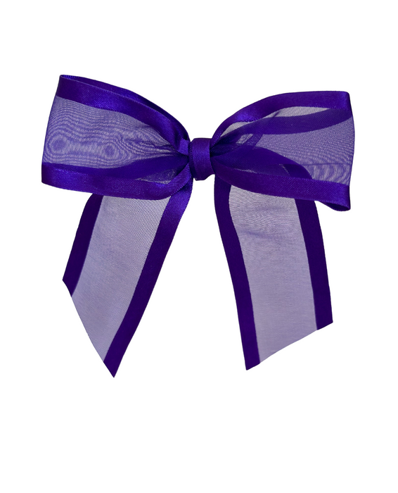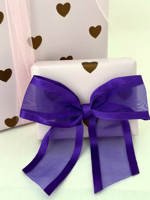 - Ribbon for Gift Wrapping - This set contains 12 Purple bows comprised of a 7/8" wide silky satin edge ribbon with a sheer Organza center. Each bow arrives pre tied and ready for use with a bow 4" wide and hanging tails.
