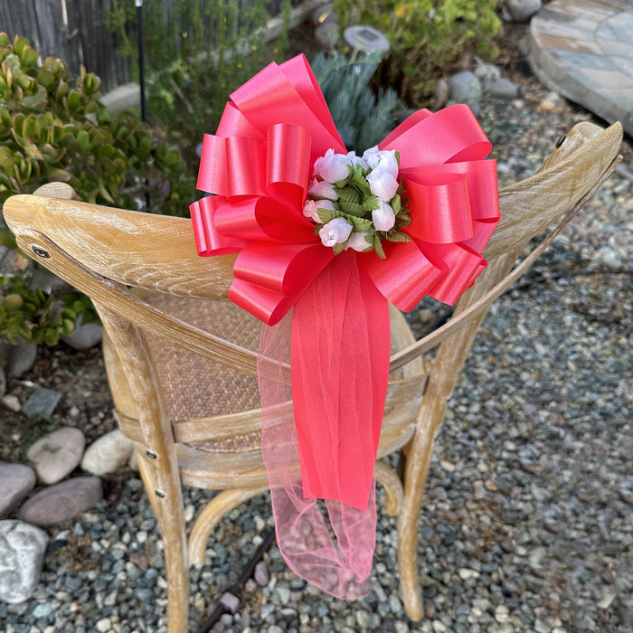 Coral Pull Bows with Tulle Tails and Rosebuds - 8" Wide, Set of 6
