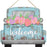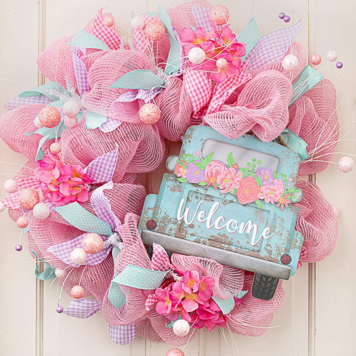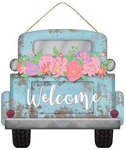 - Pink, Purple, Green and Light Pink Flowers are loaded in the bed of a Light Blue Pick-Up Truck on this vintage wooden sign with the invitation "Welcome" painted in ornate white cursive!