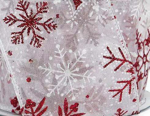 - 100% polyester wired edge sheer white Holiday Ribbon with Unique White and Red Glitter Snowflakes – Perfect for gift baskets, bows wreaths, swags, Christmas arrangements, and wrapping presents to make them sparkle!