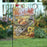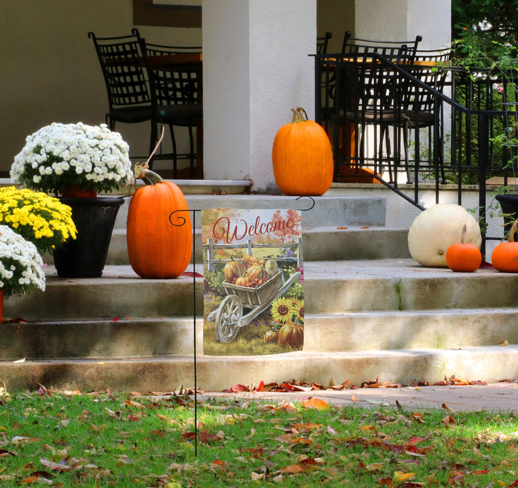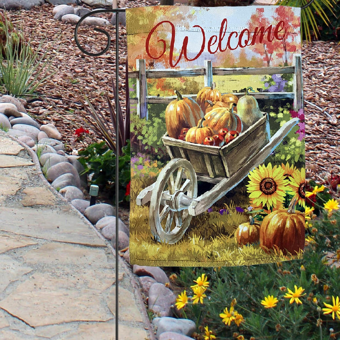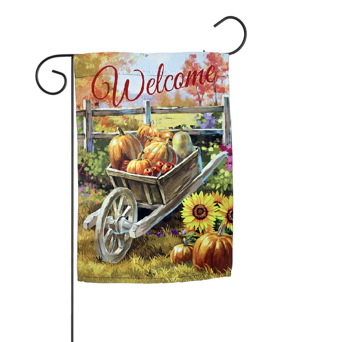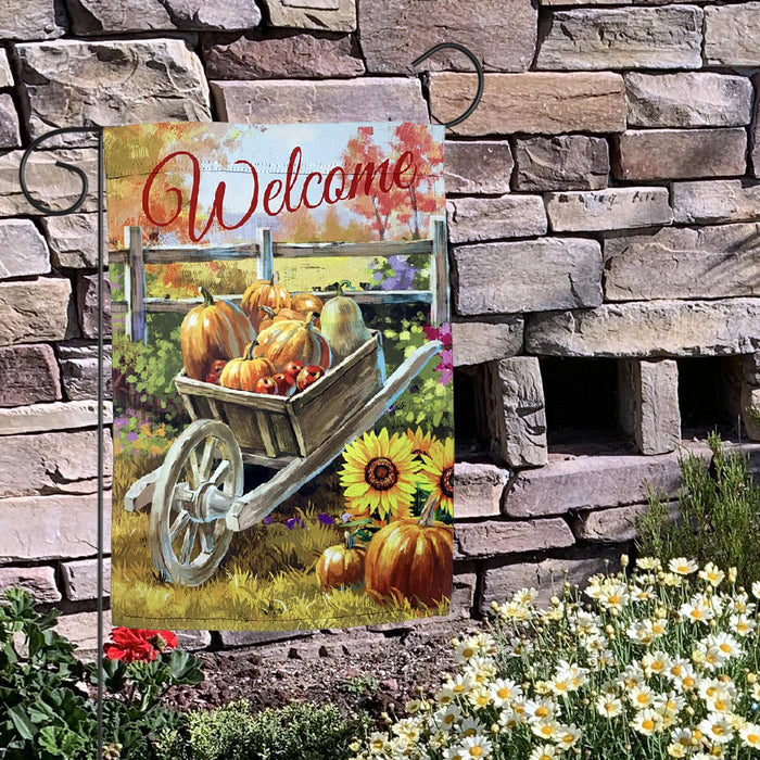 • 12 inch by 18 inch Autumn garden flag is great for showing your festive and thankful side. This multi colored welcome flag has an autumn scene with a wheelbarrow of pumpkins and other gourds next to some yellow sunflowers and changing leaves