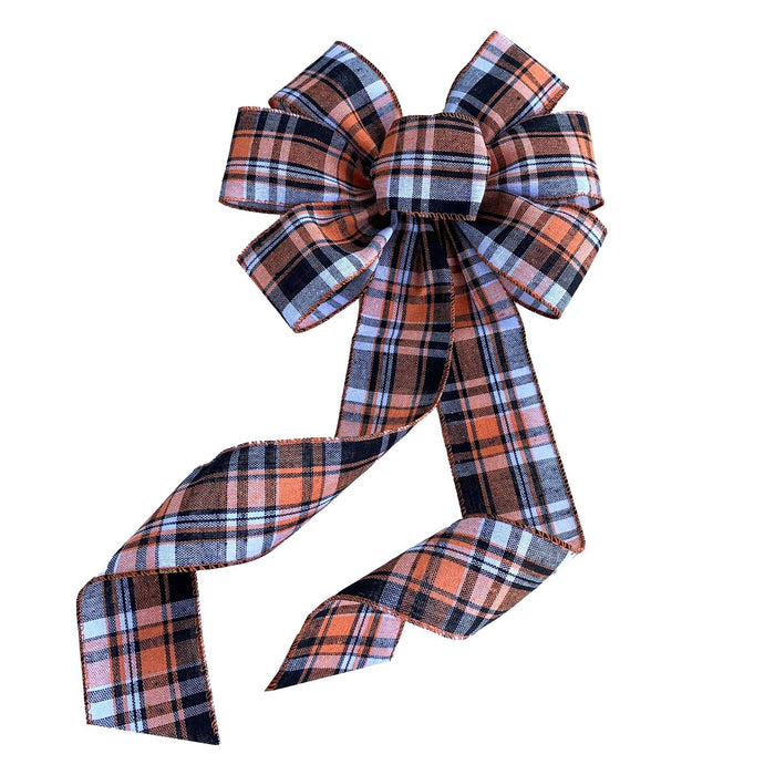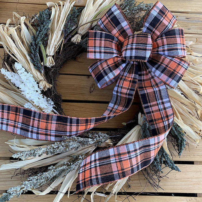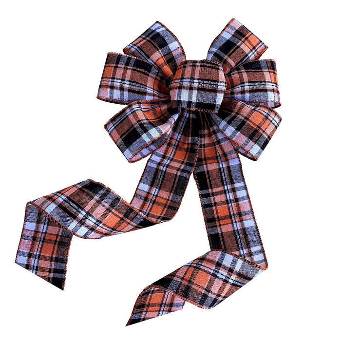 - Rustic Orange, Beige and Black Halloween plaid pattern covers the Bow - Arrives Pre-Tied and ready for use! Wire in back for attaching anywhere!