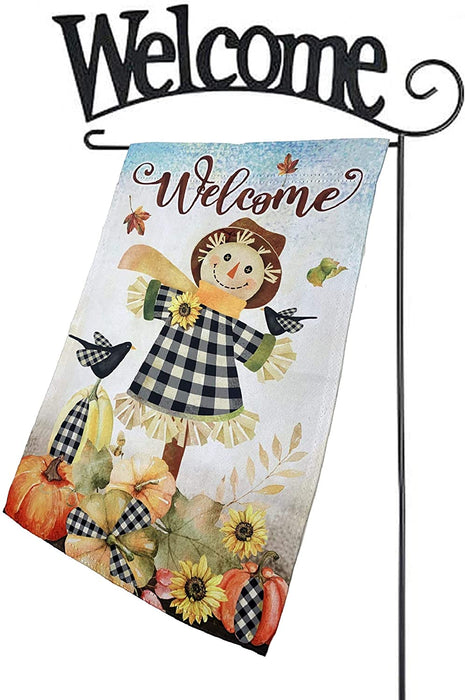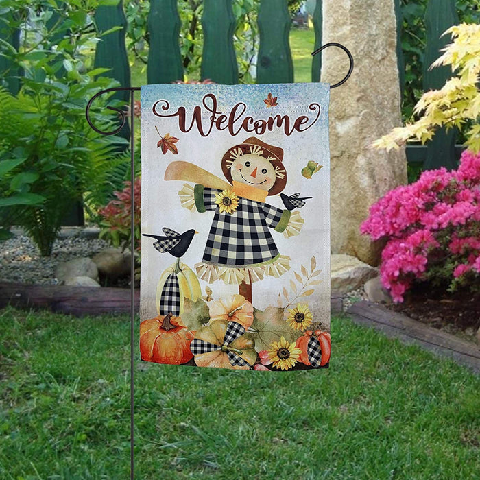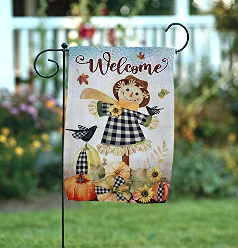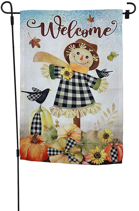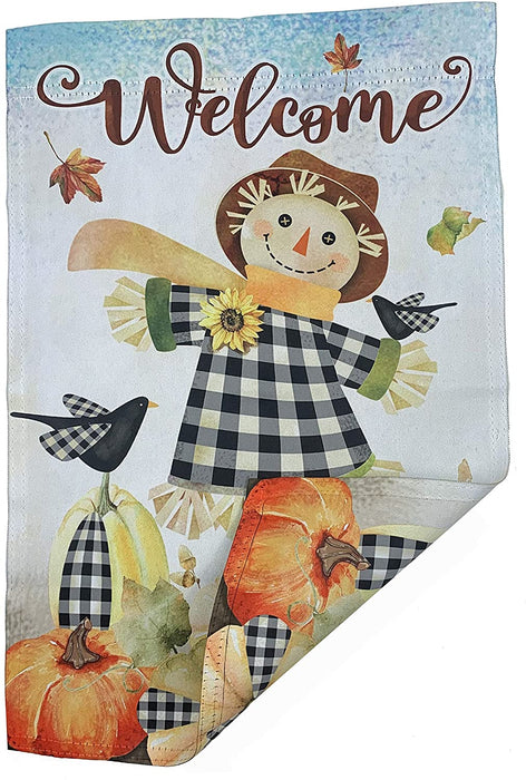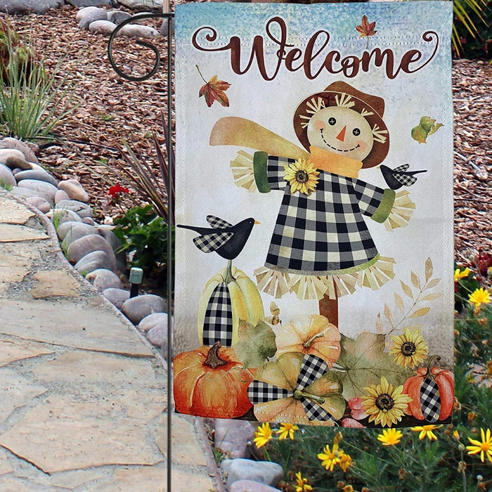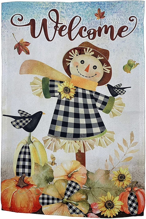 - 12 inch by 18 inch Autumn garden flag is great for showing your festive and thankful side. This multi colored welcome flag has a fall scene on a farm with a smiling scarecrow and a black bird, falling leaves, sunflowers and pumpkins all accented with black and white buffalo plaid