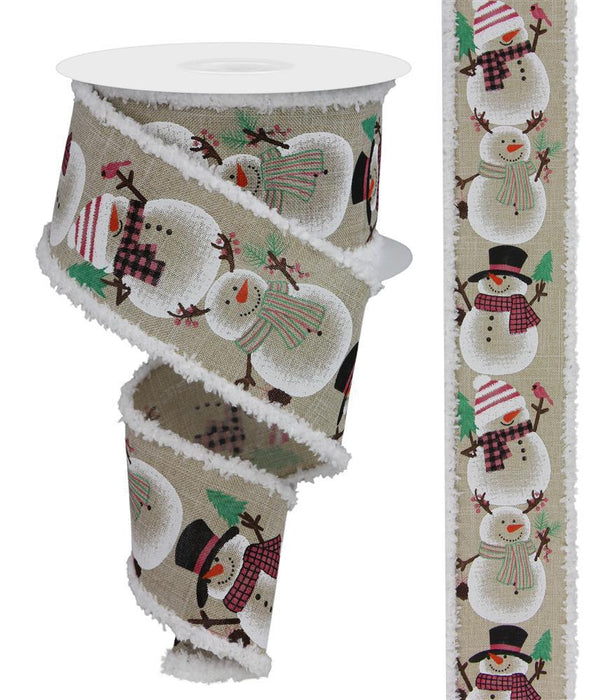 - Faux Jute Christmas Ribbon with White Fluffy wire edges and Smiling Jolly Snowmen dressed in assorted plaid, checkered and striped scarves in a roll 2.5 inch wide by 10 yds for all your holiday craft and Christmas Decorations