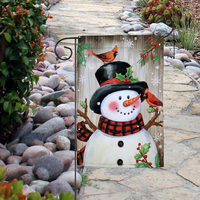 • 12 x 18 inch Christmas garden flag with a classic Snowman with Black Top Hat with mistletoe, Red Scarf, Stick Arms, Carrot Nose and Coal for eyes and buttons! Red Cardinals rest on his top hat and and arm as snowflakes fall in the background!