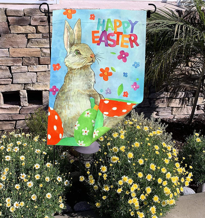 - Festive 12 x 18 inch Easter garden flag with a cute bunny rabbit next to Easter eggs with colorful text saying "Happy Easter"