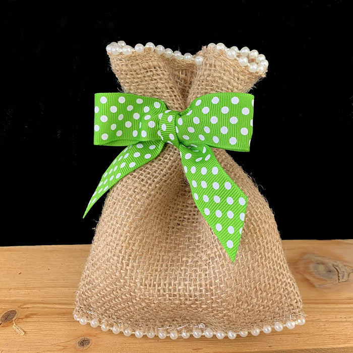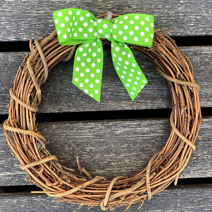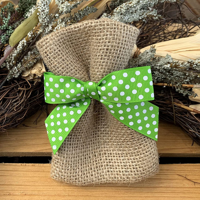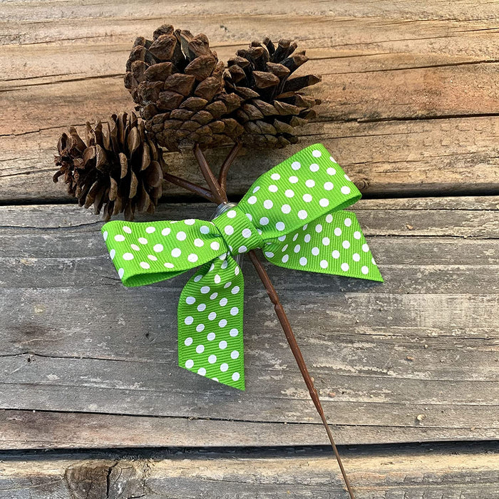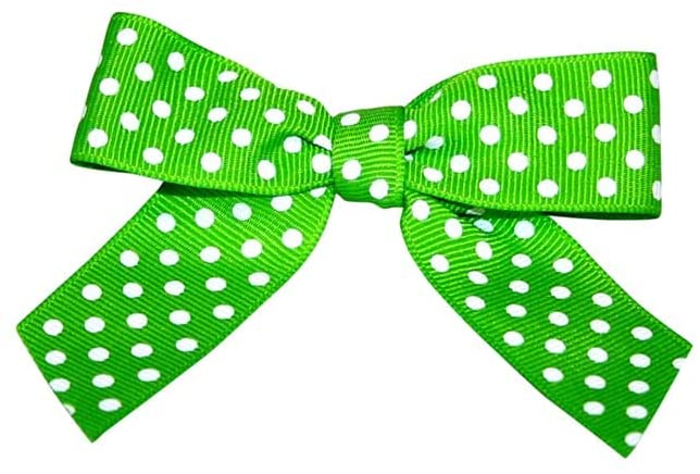- Ribbon for Gift Wrapping - This set contains 12 lime green and white polka dotted bows comprised of a 7/8" wide ribbon. Each bow arrives pre tied and ready for use with a bow 3" wide and hanging tails.