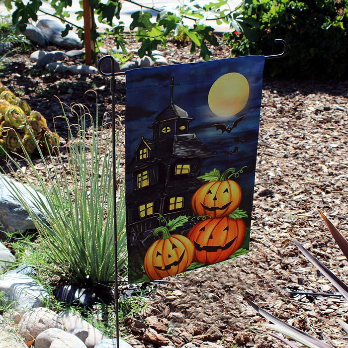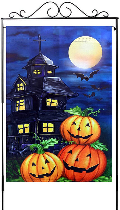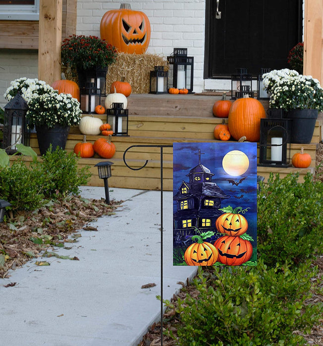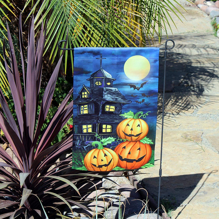 - 12 inch by 18 inch Halloween decor garden flag is great for showing your fun and spooky side. This black flag has a haunted house silhouetted by a full moon, flying bats and 3 smiling Jack-O-Lanterns.