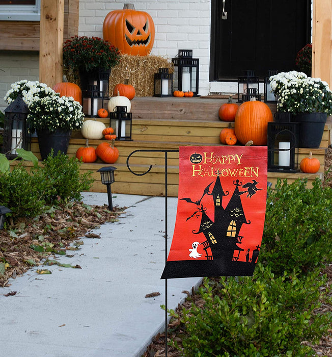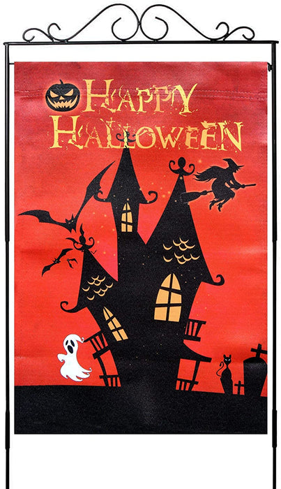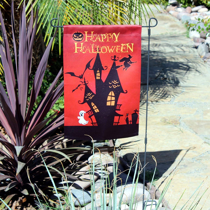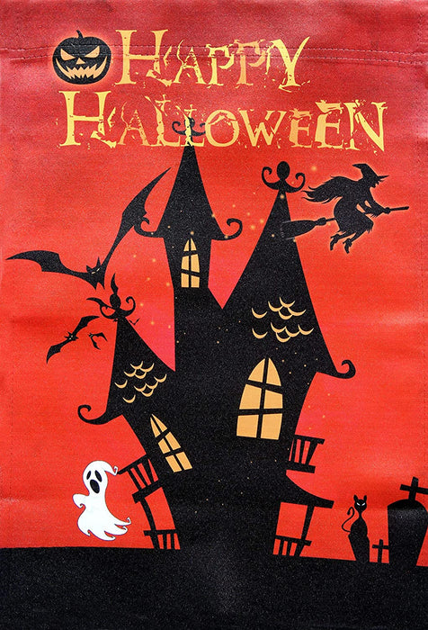 - 12 inch by 18 inch Halloween decor garden flag is great for showing your fun and spooky side. This red background flag has a silhouetted haunted house with bats, a witch, a spooky Jack-O-Lantern,a ghost and graveyard.