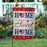 - Patriotic yard flag stating "Home Sweet Home" with the 'O' in Home changed out for an American Flag in a heart with red bars and stars all over a white picket fence background