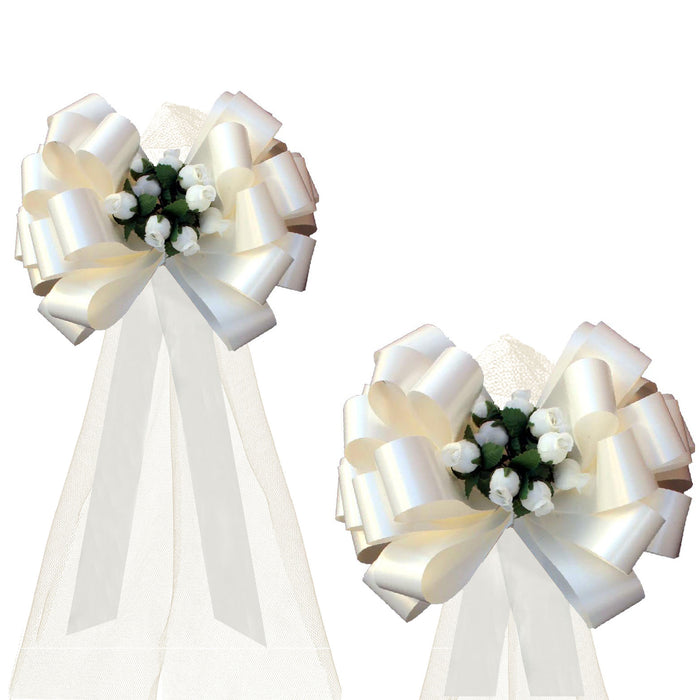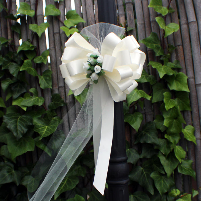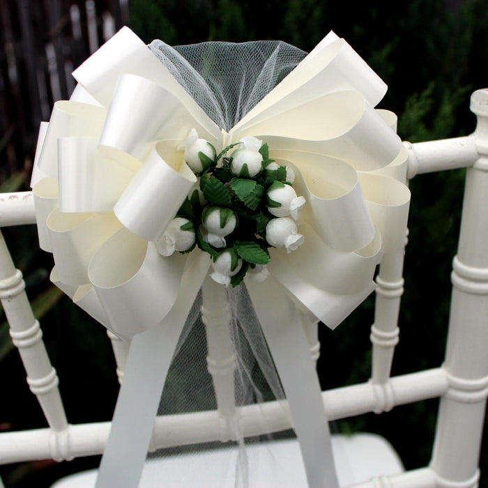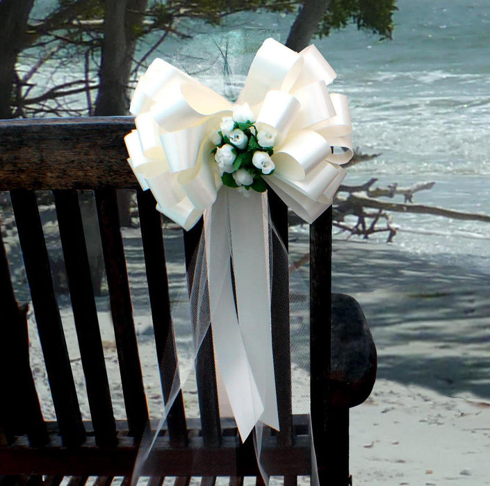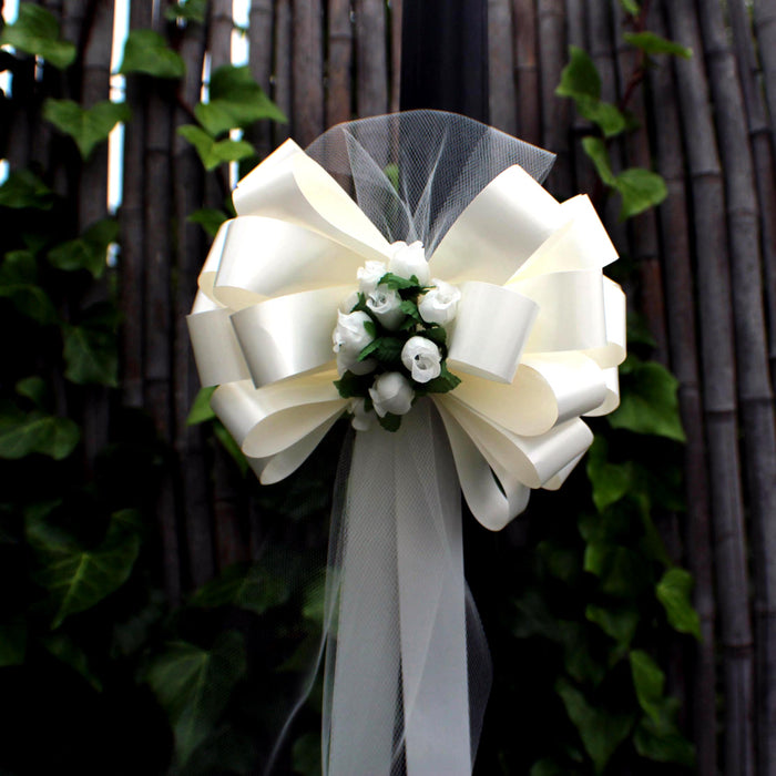 6 Ivory 8" Wedding Pull Bows with Tulle and Mini Roses, Church Aisle Decorations