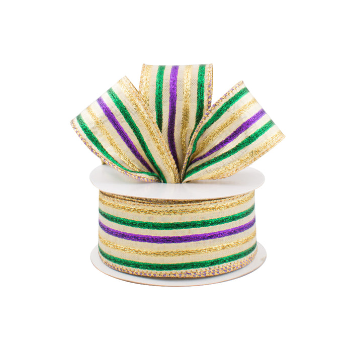 - Beige Ribbon with thin stripes of Metallic Purple, Metallic Gold and Metallic Green accented by Metallic Gold Stitched wired edges - Perfect for gift baskets, bows, and wrapping presents to make them sparkle