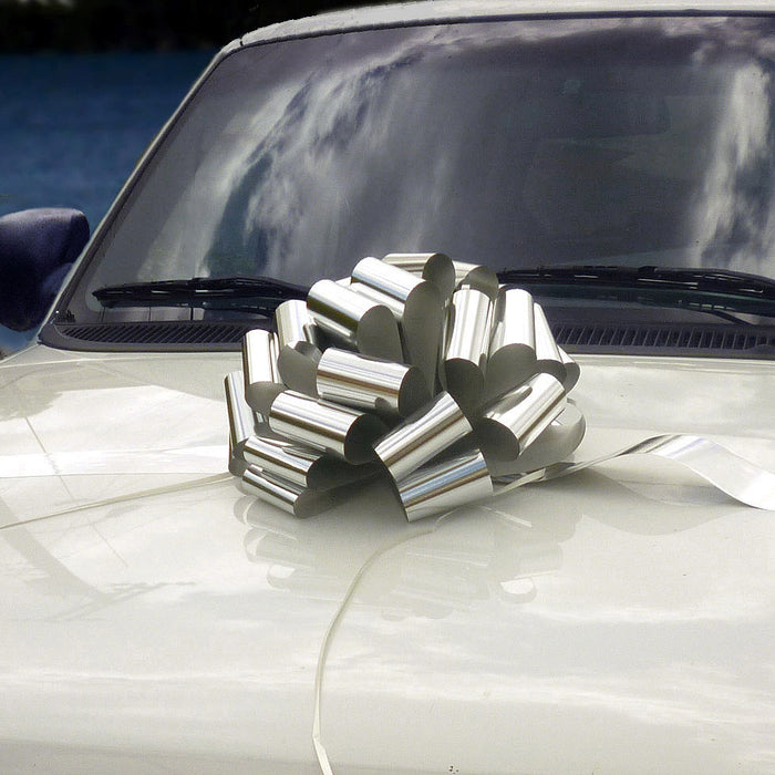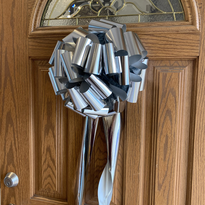 - Big 14" metallic silver gift bow, party decoration, shipped fully assembled with two flowing ribbon tails that create a total length of 40” from the top of the bow to the bottom of the tails