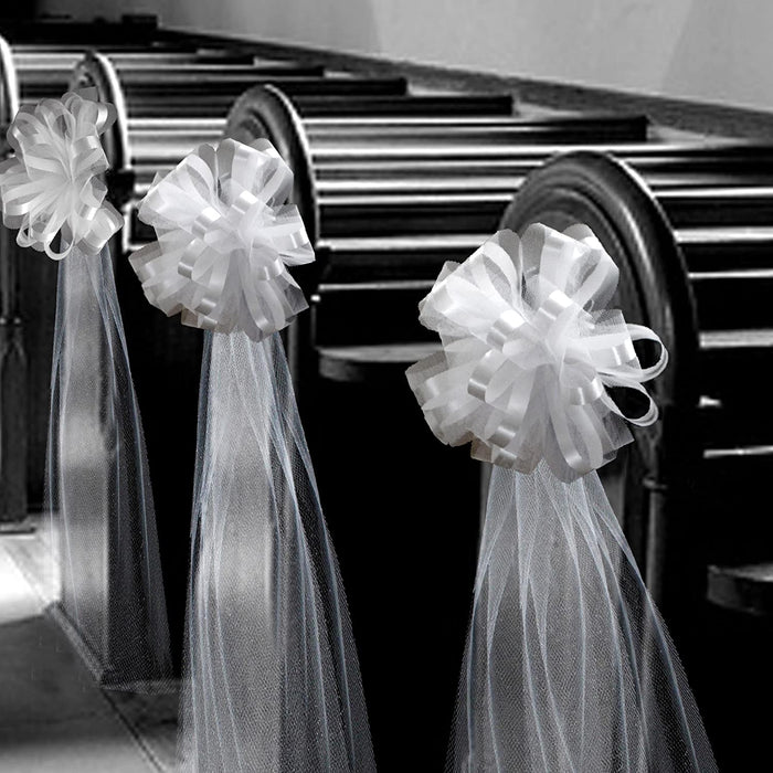 • Line the aisle at your indoor or outdoor wedding ceremony with these beautiful 10 wide fully assembled white tulle pew bows