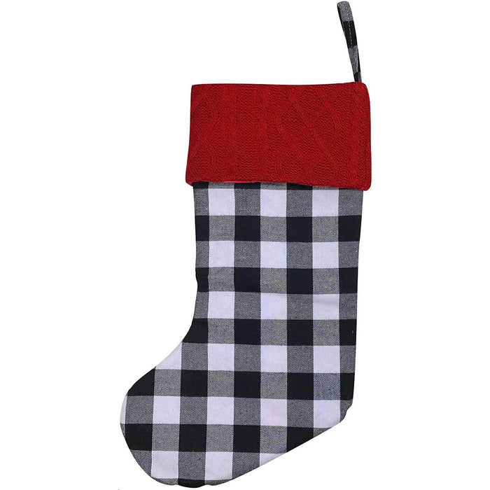 - Modern White and Black Buffalo Plaid Christmas Stocking with a Bright Red Knit Cuff! - 20 inch long by 8 inch wide with a deep boot pocket for gifts!